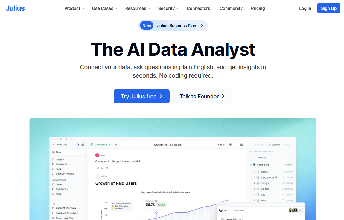 - AI Data Analyst: Julius reads your spreadsheets, CSVs, and databases, then runs the analysis you ask for in plain language.